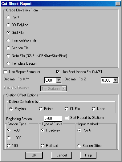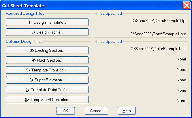 The Template Design option defines the grade elevation using road design files. For each point, the program finds the station-offset for the point along the centerline and then applies the road design at that station to determine the grade elevation. Grade to Process is used to define the surface to use for the cut sheet comparison. These grades are defined as Top Surface, usually final grade, or subgrades and correspond to the defined grades and subgrades within a template file. The required design files include a centerline (.CL) file, a template (.TPL) file, and a profile (.PRO) file. There are also several optional design files such as Superelevation, Template Point Profile and Template Point Centerline. The design files are created in the Civil Design module. Using the design files in Cut Sheet is similar to the Process Road Design command.