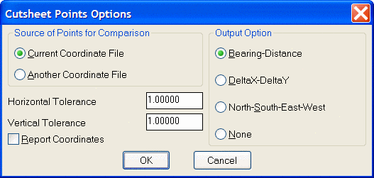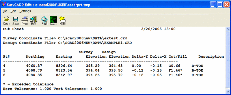 | Example 2: Cut Sheet Report comparing points from Another Coordinate file, reporting coordinates for the points. |