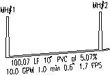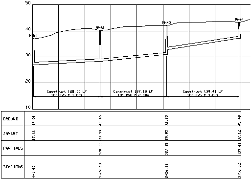| Example of sewer profile using Horizontal Axis Text Orientation as Vertical and Pipe Label Position as Horizontal Dimension |