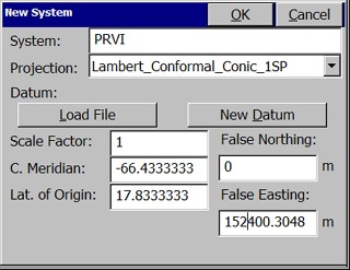 Then click on the "Add User Defined" button. Enter a name for your system (e.g. PRVI for Puerto Rico/Virgin Islands), then select a projection (in the example below, Lambert_Conformal_Conic_2SP) and enter the appropriate parameters. Note that all latitude and longitude values are in decimal degrees and False Northing and False Easting are always presented in meters. All entries involving degree must be in decimal degrees based on a 360 circle.