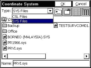 RD2000: This is the RD NAP transformation for the Netherlands. This system is a grid transformation that requires the file “Predef1.csl”, “X2C.grd” and “Y2C.grd”. The “Predef1.csl” file is part of the default installation. You will need to use Data Transfer to copy the “X2C.grd” and “Y2C.grd” files from your CD to your data collector.