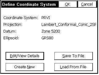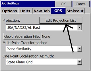 Load File: To load a user defined coordinate system from a file, go to File, Job Settings, GPS and click on the “Edit Projection List”. Select “Add User Defined” and select Load File. Then click on the “Define” button. Select “Load File”. Change the File Type to “sys” or “csl” depending on the type of file you are loading. A “sys” file will be associated with each job. You can load the projection last used on a survey job by loading its “sys” file. Select your file and say OK. If you have selected a csl file, you will be asked to choose from a list of system definitions found in the file. For the “csl” type, you may verify that the details of your system have been loaded correctly by clicking the edit option.
