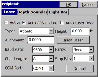 A Peripheral is a device that must be used in tandem with a GPS receiver or a total station. Peripherals can all be configured from the Peripherals menu under the Equipment tab. Lasers, Light Bars, and Depth Sounders are all supported as peripherals. If a peripheral is not currently in use, it is strongly recommended that you deactivate it, so it does not slow down other operations. Lasers such as the Leica Disto can be used for both horizontal offsets and can be set to supplement the rod height for data collection “at the pole” using robotic total stations or GPS for marine or ATV surveys.