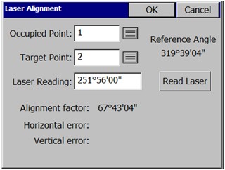 - Click Read Laser, and when the Reading Laser progress bar appears, fire your laser at the target point from your occupied point. An azimuth reading will appear in the Laser Reading box, and two values will be calculated: The Reference Angle is the azimuth of the vector from the occupied point to the target point. The Alignment Factor is the difference between the azimuth read by the laser and the Reference Angle.