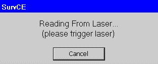 - A progress window should pop up, indicating that Carlson SurvCE is ready to read from the laser. Aim the laser and fire at a target point. Keep firing until your laser returns a valid reading, and the progress window disappears.