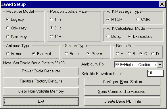Radio Port on the Javad base and rover receiver is usually C. Data Port is always A. When using Pacific Crest radios, Javad recommends the new PDL Pacific Crest radios. These must be set to 38,400 baud rate. Javad also uses Spread Spectrum radios which work at 119,200 baud rate.