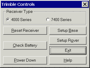 Carlson Field works with the following Trimble receivers: 4000 series, 4700, 4800, 7400, NT300D, GeoExplorer and Pathfinder. The type of receiver is set in the Configure Field command. The options available in the GPS Setup dialog depend on the current type of receiver.