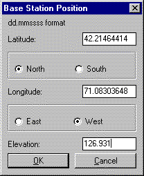 Enter Lat/Lon - requires you to enter the latitude and longitude for the position of the base antenna. This is useful if you are setting up over a USGS monument whose lat/lon you know. It can also be used over a control point whose position is known from GPS post-processing.